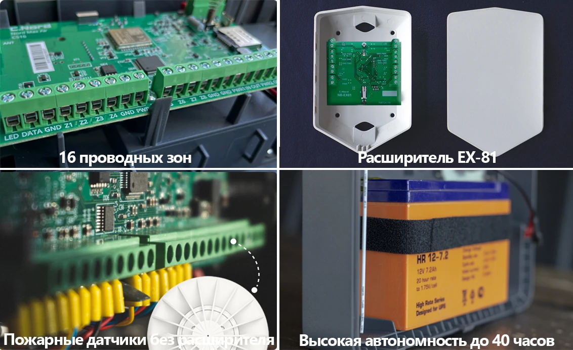 - Гибридная архитектура: до 16 проводных и 31 беспроводного устройства без расширителей.