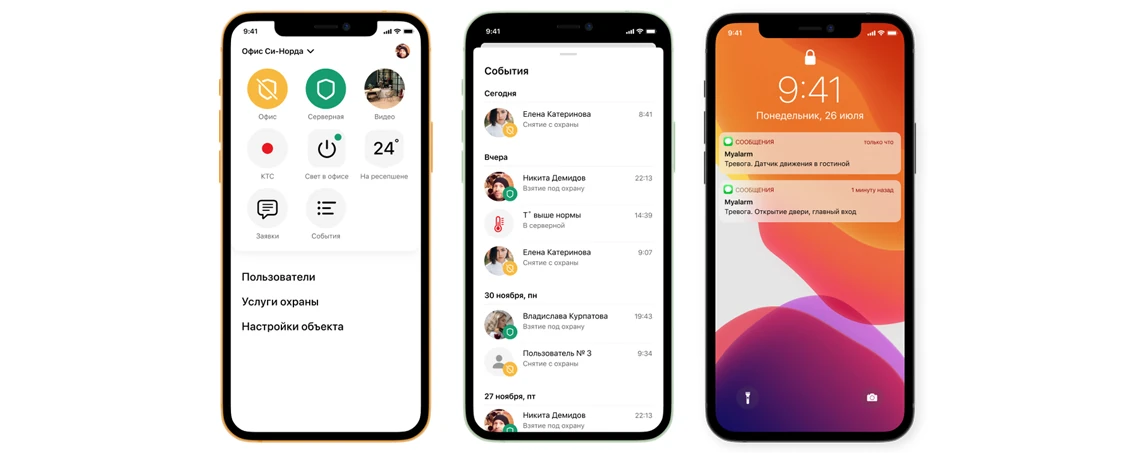 Это актуально, например, для больших офисов. Пользователи могут снимать и брать офис под охрану, получать уведомления о событиях и тревогах.