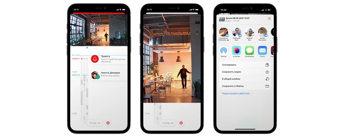 В приложении отмечаются события охранной системы и движение в кадре. Архив видео хранится в Облаке, любой фрагмент видеозаписи можно сохранить и поделиться им в мессенджере.