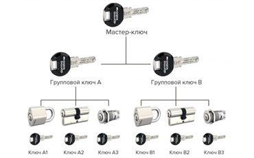 Такая «мастер-система» состоит из главного мастер-ключа, который открывает все двери в организации, плюс групповой мастер-ключ для замков конкретного отдела и классические индивидуальные ключи от каждого кабинета.