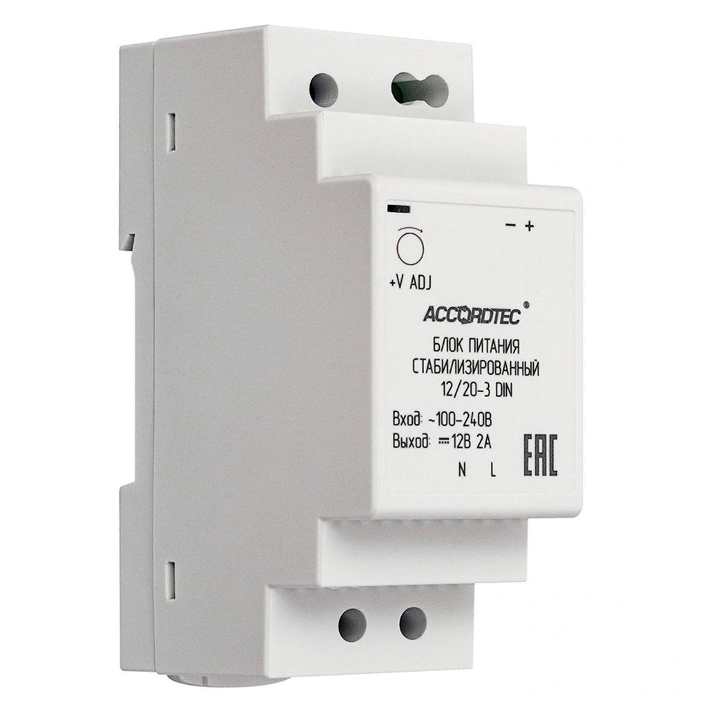 AccordTec AT-12/20-3 DIN отличается возможностью регулировки выходного напряжения в пределах 10.8–13.8 В ±5%, что дает гибкость при подключении различных устройств. При номинальном токе нагрузки 2 А и максимальном до 2.2 А (кратковременно) блок питания обеспечивает стабильную работу подключенного оборудования. Простое подключение через клеммы под винт и отсутствие сетевого шнура делают модель удобной для профессионального монтажа в инженерных системах.