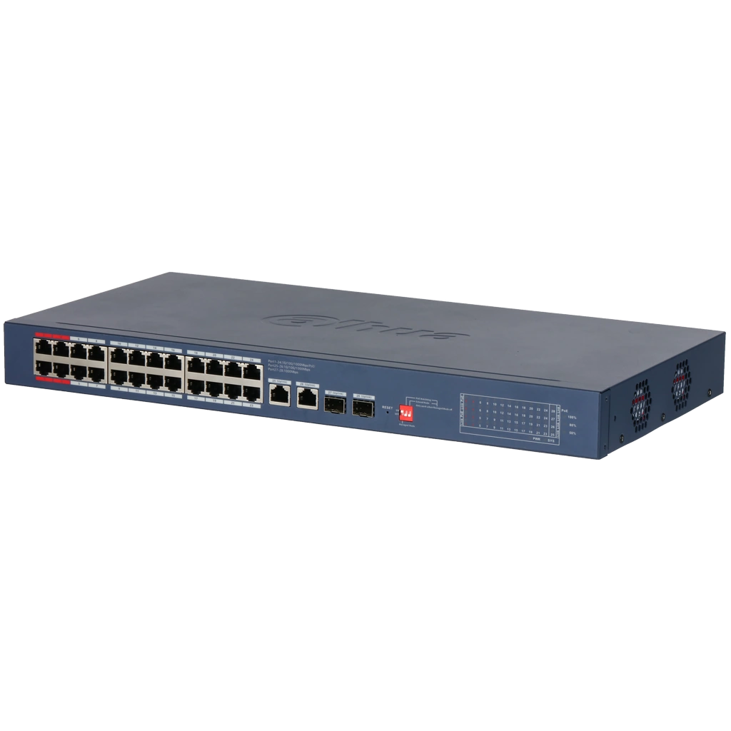 - 28-портовый коммутатор: 24 × RJ-45 PoE + 2 × RJ-45 uplink + 2 × SFP uplink.
