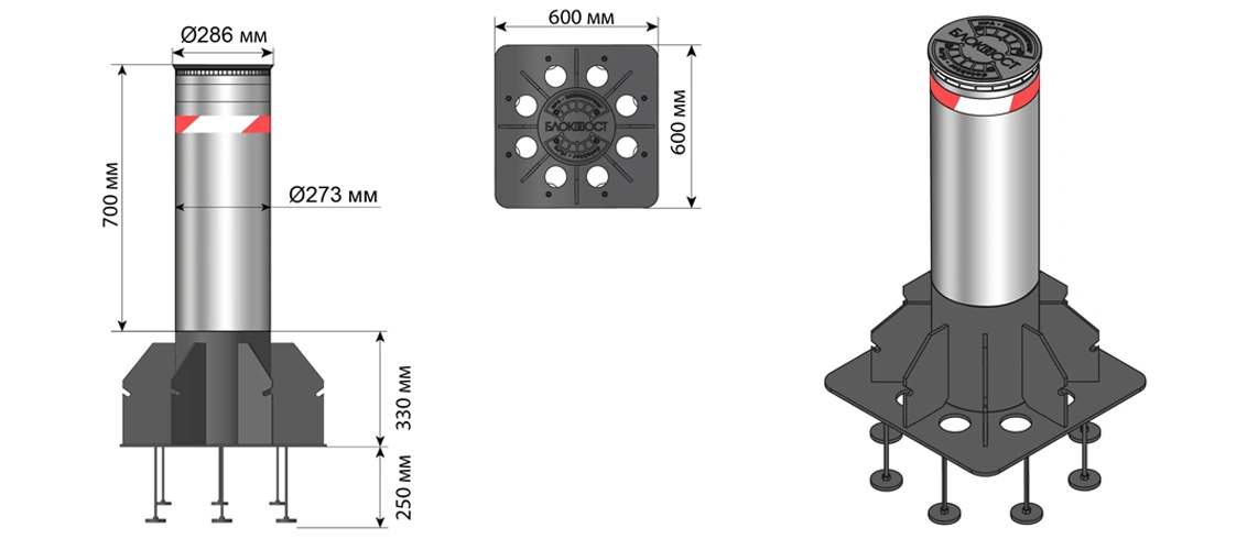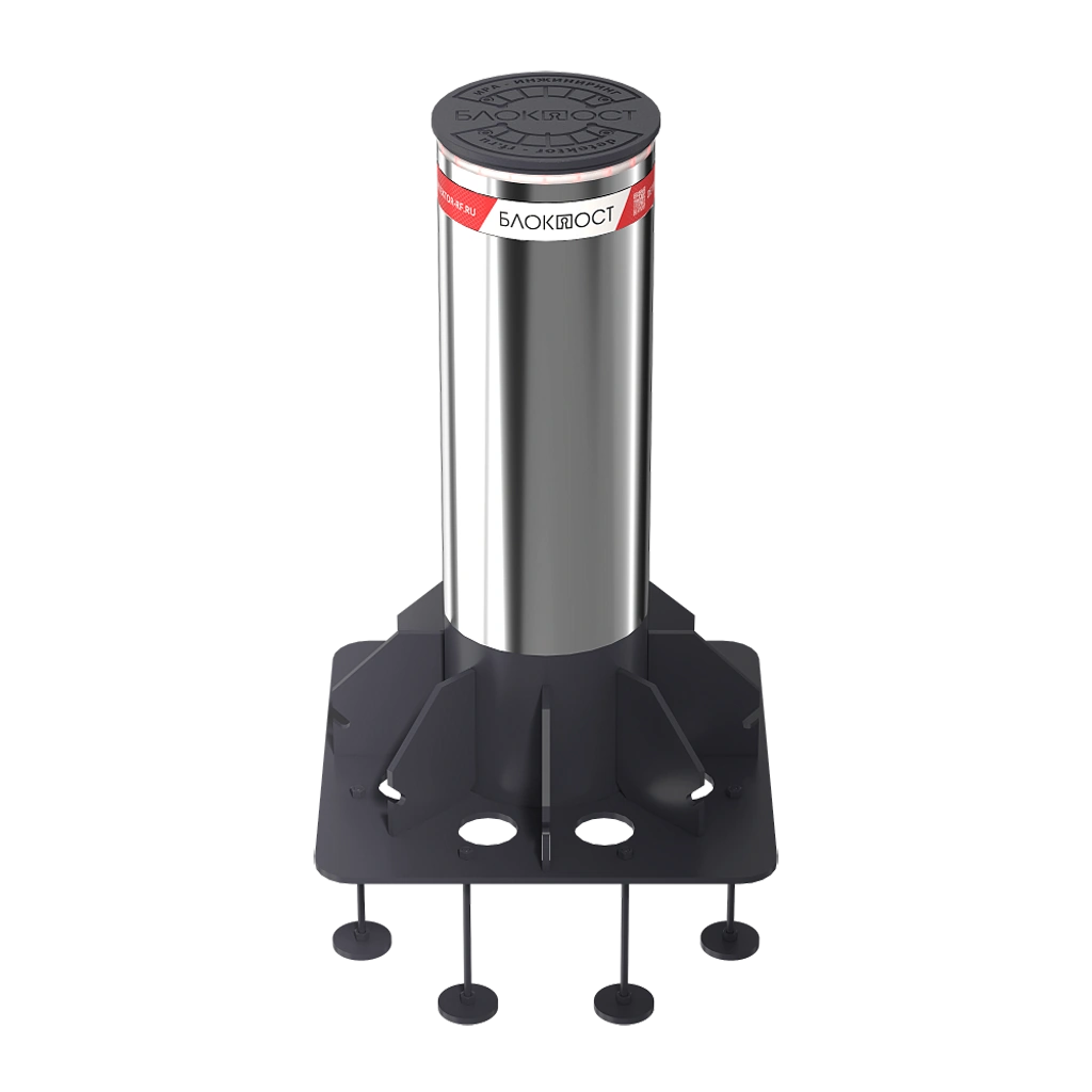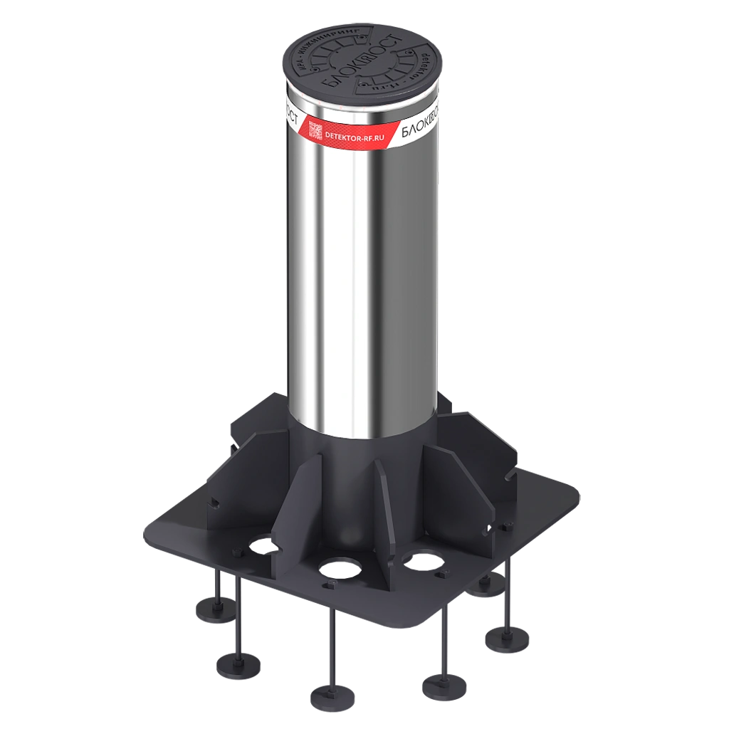 Корпус цилиндра изготовлен из нержавеющей стали толщиной не менее 10 мм, что обеспечивает устойчивость к коррозии, атмосферным воздействиям и механическим нагрузкам. Верхняя крышка и основание выполнены из окрашенного антикоррозийного чугуна. Благодаря этим материалам боллард сохраняет функциональность и внешний вид даже при эксплуатации в условиях постоянной влажности, перепадов температур и дорожных реагентов. Красная светодиодная подсветка делает устройство хорошо заметным в темное время суток и повышает безопасность движения.