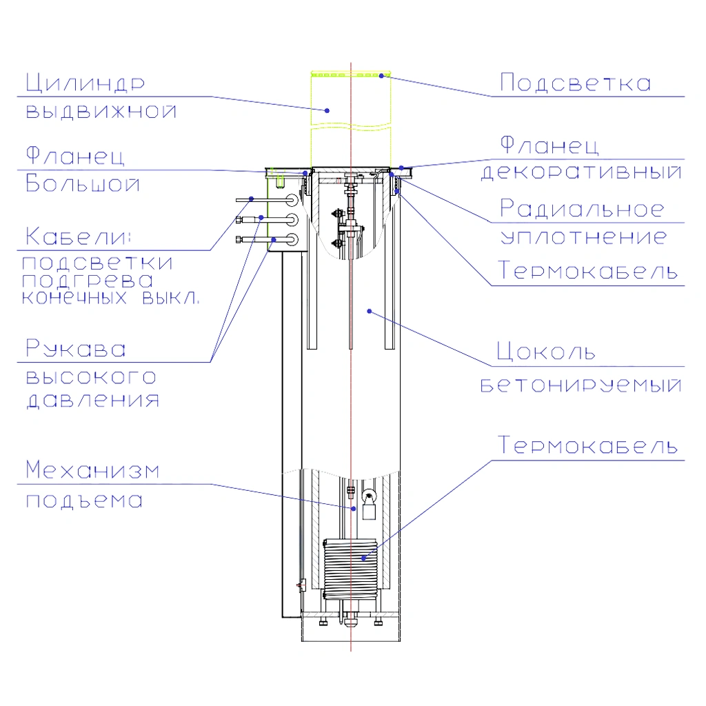 Цоколь бетонируемый - металлическая конструкция в виде круглой трубы. В верхней части имеется фланец, к которому впоследствии крепится фланец большой.На боковой стороне расположены отверстия, через которые выводятся рукава высокого давления от механизма подъема и кабели подсветки, обогрева и концевых выключателей.