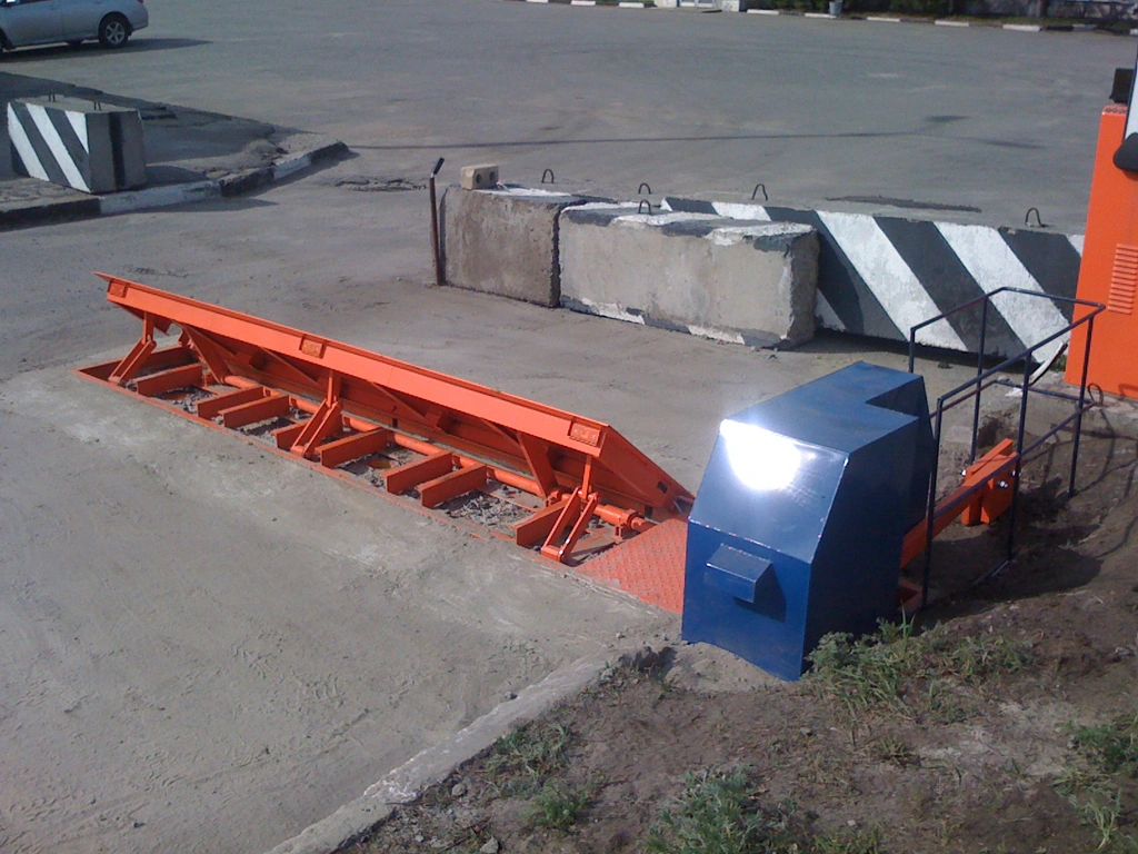 Основными частями являются основание, платформа поворотная заградительная и Привод подъёма.Конструктивно основание и платформа поворотная представляют собой рамы, изготовленные из стального проката (рифленый лист, швеллер и профильная труба). Поворотная платформа крепится к основанию с помощью петель и блокирующих тяг (цепей). Платформа оснащена светодиодными катафотами, позволяющими определить препятствие в темное время суток.