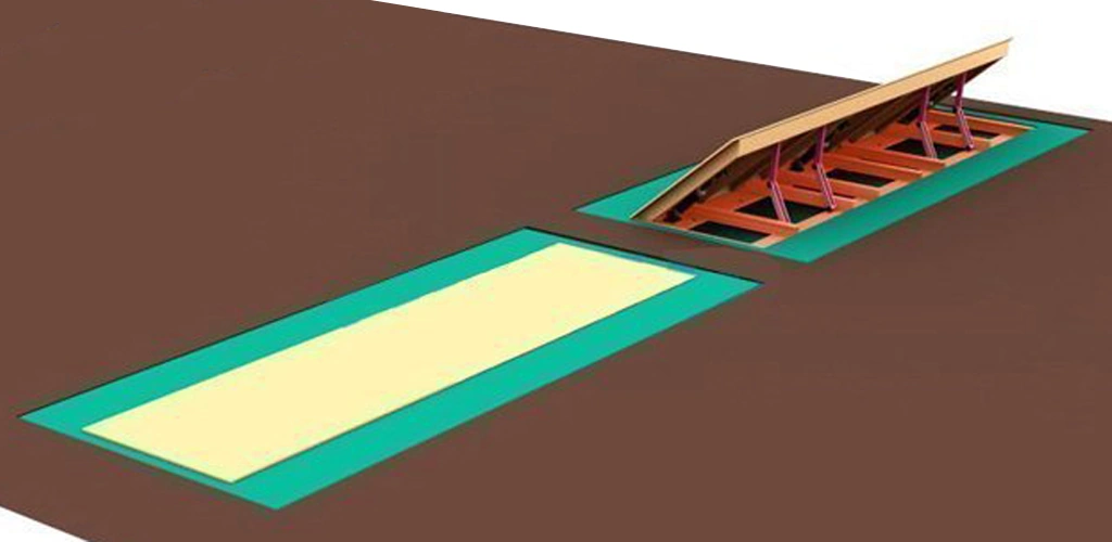 Поворотная заградительная платформа поднимается на рабочую высоту за ≤3 секунды благодаря гидроприводу с давлением 6–7 МПа. Рамы выполнены из стального проката с рифлёным листом, поворотная часть шарнирно связана с гидроцилиндром. При подъёме платформа фиксируется запиранием масла в подводящей линии, при подаче давления в обратную линию опускается в исходное положение. В опущенном положении пандусы обеспечивают безопасное движение, не требуя изменения уровня дороги.
