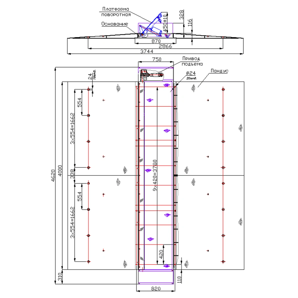 Привод подъема – линейный привод LA36 (актуатор). Поворотный вал, установленный внизу основания в опоре с подшипником скольжения, посредством рычага связывает привод с поворотной платформой. В холодное время года предусмотрен подогрев привода термокабелем. В пульте управления есть соответствующий выключатель.