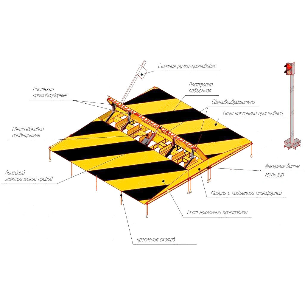 Блокиратор «Скат-2400У» сочетает простоту конструкции и высокий уровень надежности. Он может устанавливаться как стационарно — на анкерную арматуру, так и в мобильном исполнении с возможностью быстрого монтажа. Электропривод европейского производства обеспечивает плавный подъем и опускание платформы за считанные секунды, а светозвуковая сигнализация и светоотражающие элементы повышают безопасность эксплуатации.