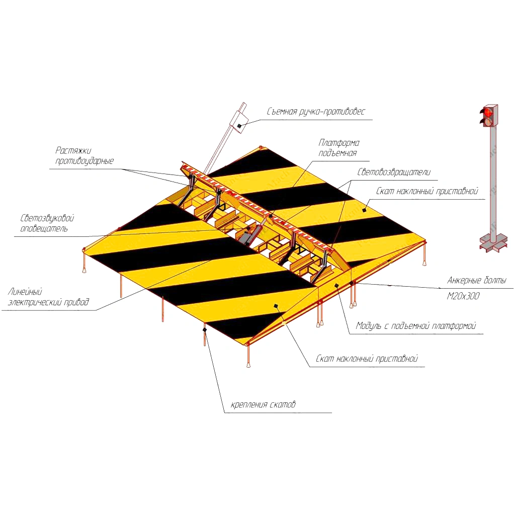 Дорожный блокиратор Скат-3150УП — усиленное противотаранное электромеханическое устройство накладного типа, предназначенное для обеспечения инженерной защиты охраняемых объектов. Конструкция составная, включает базовую платформу и два удлинённых пандуса, что облегчает проезд низкоклиренсных автомобилей и делает устройство универсальным для использования в транспортных шлюзах, КПП и на промышленных территориях. Благодаря автоматическому электроприводу устройство обеспечивает надёжную блокировку проезда и быстрое освобождение дороги при необходимости.