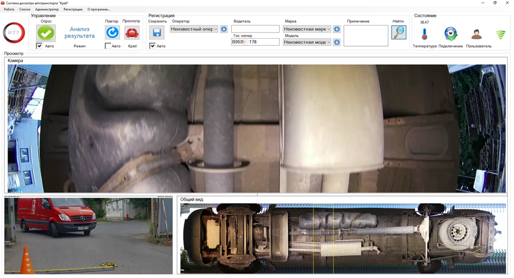 В процессе работы система автоматически фиксирует изображения днища транспортного средства и передает их в специализированное программное обеспечение для отображения и анализа. При отсутствии модуля автоматического распознавания государственных регистрационных знаков номер автомобиля вводится оператором вручную и сохраняется в базе данных с привязкой к изображению и дате видеофиксации. Это обеспечивает формирование архива досмотров и возможность последующего анализа проездов.