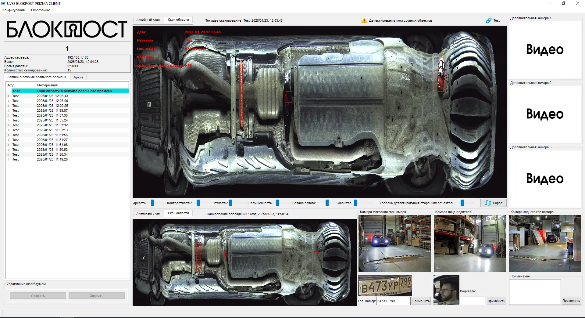 При подъезде автомобиля система активирует подсветку и готовность сканирования. В процессе проезда модуль формирует высокодетализированное изображение днища, а передняя и задняя LPR-камеры фиксируют государственные регистрационные знаки. Камера водителя записывает лицо для идентификации. Готовое изображение отображается оператору на рабочем месте, сохраняется в базе данных и может быть использовано для дальнейшего анализа и сопоставления при повторных въездах. Интерфейс программы позволяет управлять периферийным оборудованием въездной группы.