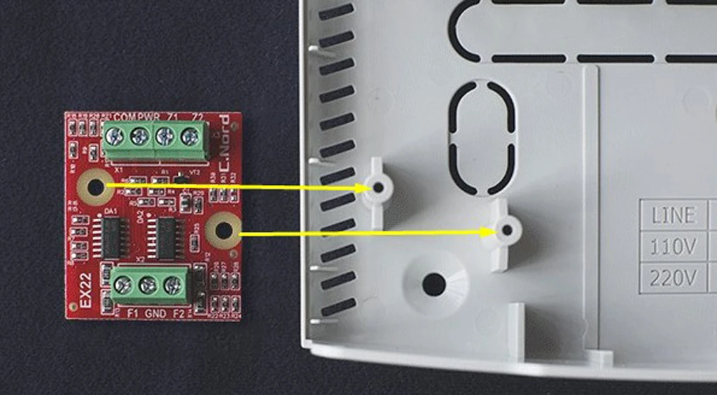 - Установите EX22 внутрь прибора на стойки в левой нижней части корпуса и подключите по схеме. Подключите пожарные извещатели к ЕХ22.