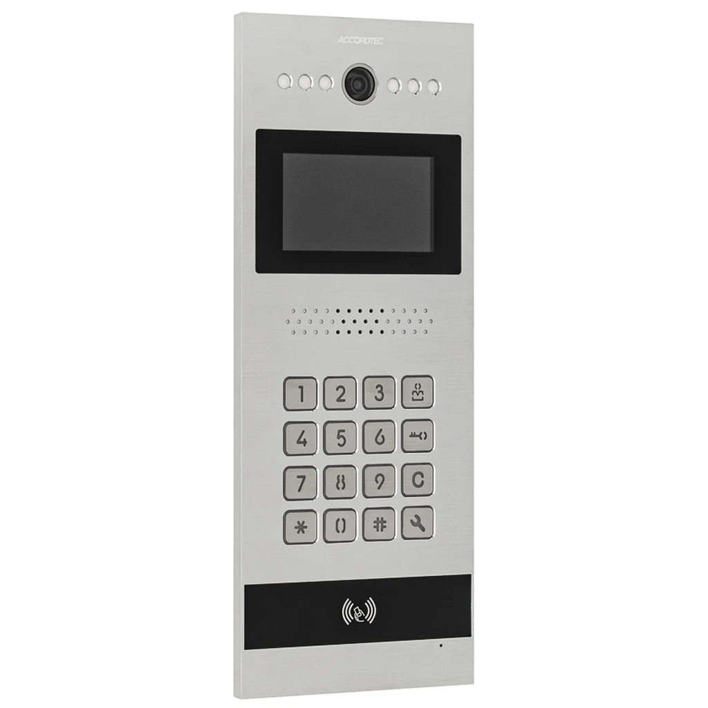Корпус панели имеет высокую степень защиты IP54, которая надежно предохраняет электронику от влаги, пыли и воздействия окружающей среды. Устройство рассчитано на врезной монтаж и оснащено считывателем карт формата EM, позволяющим организовать удобный и безопасный доступ для жильцов. Панель поддерживает хранение до 2048 карт пользователей, а также возможность ввода кода доступа, что делает систему универсальной и удобной для многоквартирных домов.