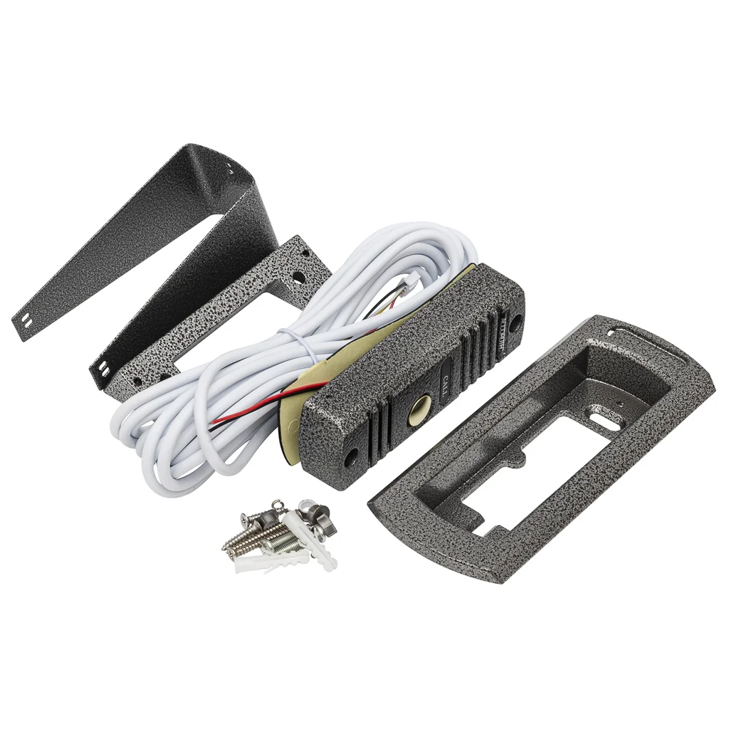 Устройство поддерживает стандартный формат видеосигнала CVBS, что гарантирует совместимость с большинством аналоговых мониторов и видеодомофонов. Благодаря углу обзора 68° камера позволяет контролировать пространство перед дверью и фиксировать все события у входа. В комплект входят дополнительные аксессуары — козырек, кронштейн для врезного монтажа и угловой кронштейн, позволяющий установить панель под углом 30° для оптимального обзора.