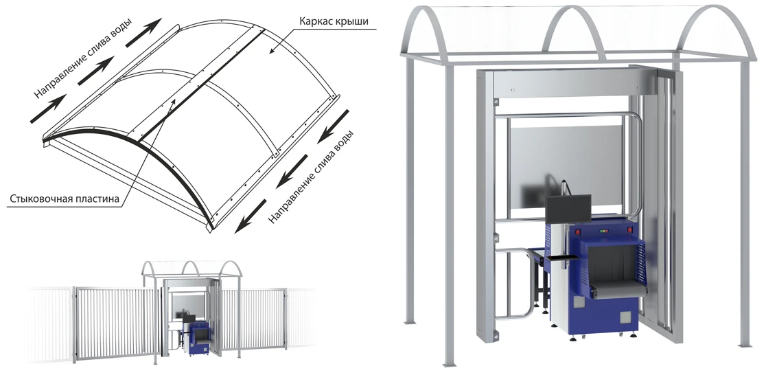 Для обеспечения наибольшей безопасности на проходной рекомендуем использовать комплекс из нескольких полноростовых турникетов и модуля для установки РТУ, металлодетекторов, рентгенотелевизионных установок под навесом. Металлодетектор обеспечивает контроль проноса металлических предметов проходящих через него людей. Стационарная рентгеновская установка предназначена для досмотра личных вещей и обследования отдельных предметов (посылок, бандеролей, ручной клади и т. п.) с целью обнаружения в них незаконных вложений, таких как: взрывные устройства, холодное и огнестрельное оружие и другие запрещённые к провозу предметы