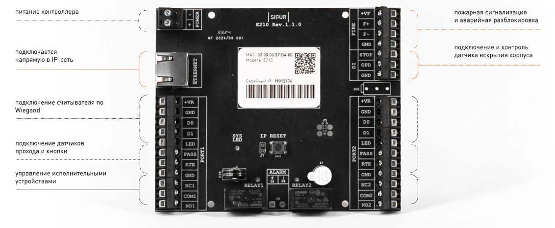 Контроллеры Sigur E210 предназначены для автоматизации проходной или организации доступа во внутренние помещения заказчика. Устройства поддерживают подключение до двух считывателей по интерфейсу Wiegand и до двух исполнительных устройств (электромагнитные или электромеханические замки), подключение дополнительных датчиков и линии пожарной сигнализации. Поддерживается индикация состояний контроллера.