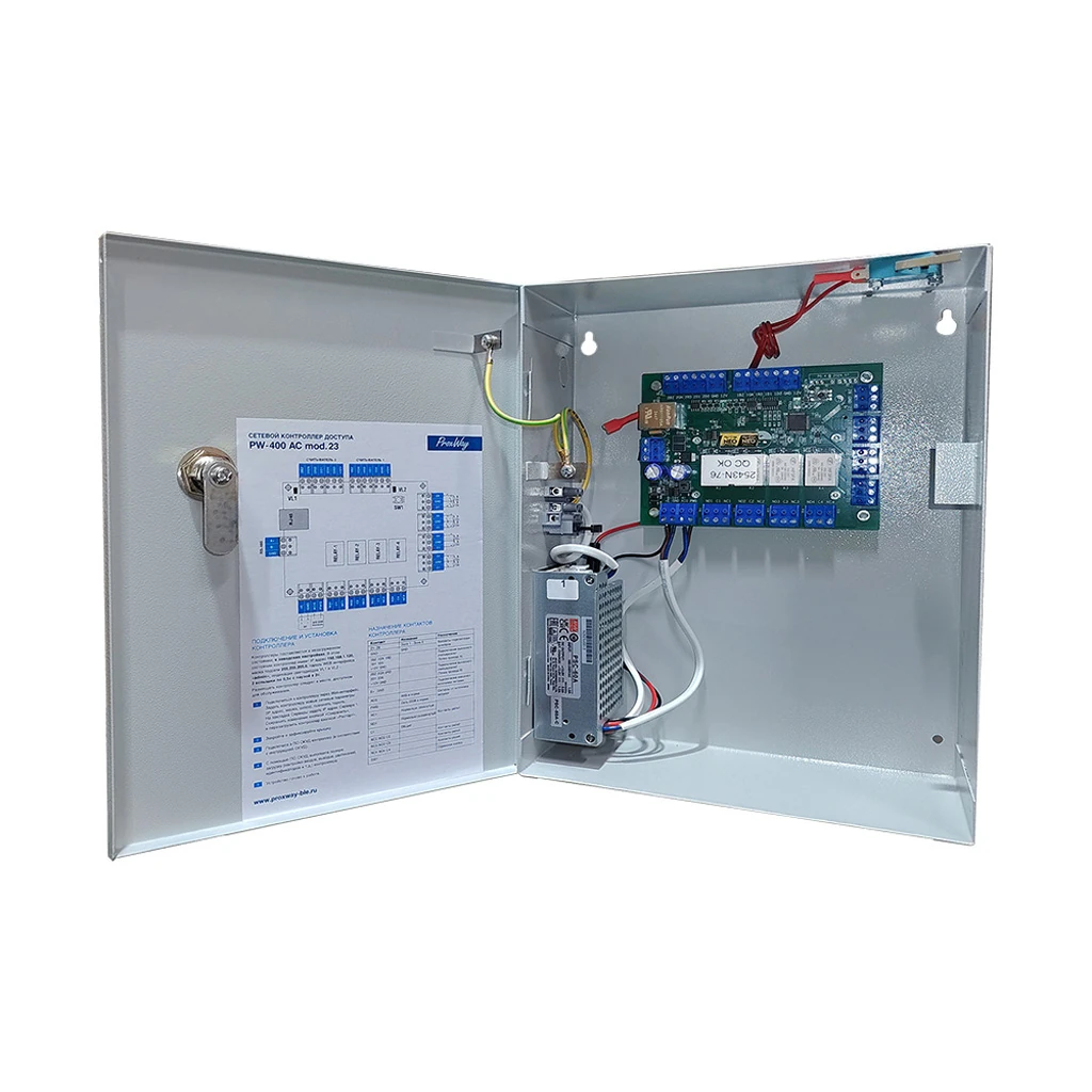 Модель PW-400 AC mod.23 оснащена сетевым интерфейсом Ethernet 10/100 Мбит/с и может функционировать как автономно, так и в составе крупной распределённой СКУД. Подключение считывателей осуществляется по протоколу Wiegand, а энергонезависимая память сохраняет десятки тысяч идентификаторов и событий. Программируемые входы и релейные выходы позволяют гибко конфигурировать систему, подключать замки, турникеты, сирены и другие исполнительные устройства.