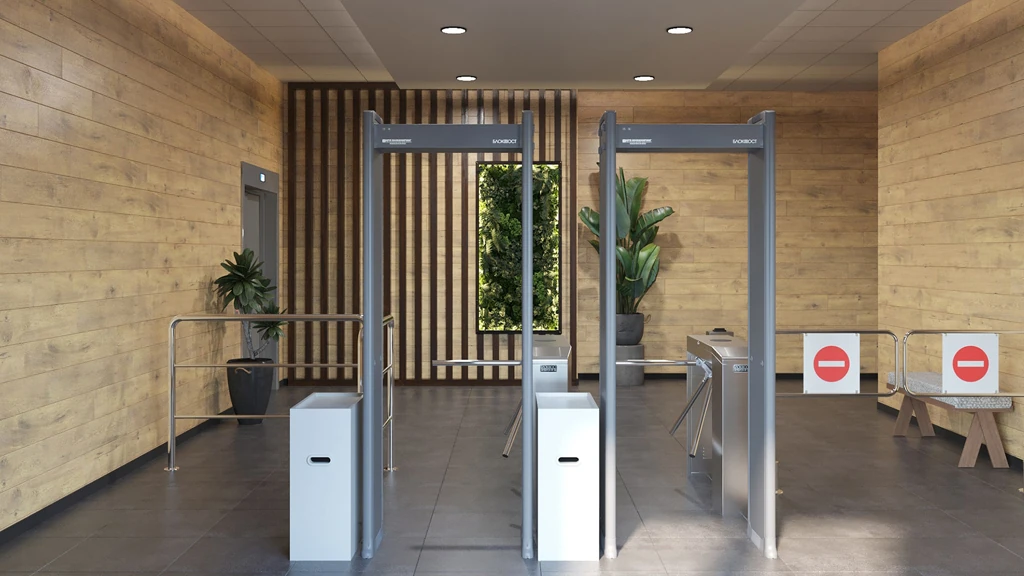 Оптимальное размещение металлодетекторов зависит от условий эксплуатации. Для объектов с высокой проходимостью (аэропорты, вокзалы, массовые мероприятия) рекомендуется установка нескольких проходных зон, разделённых направляющими барьерами. В узких проходах, коридорах и на закрытых территориях металлодетектор можно комбинировать с турникетами или шлюзовыми кабинами. Кроме того, устройства могут быть синхронизированы для работы в связке до 50 конструкций, что позволяет организовать единый проходной комплекс. Минимальное расстояние между металлодетекторами при этом должно составлять от 50 см, чтобы избежать взаимных помех.