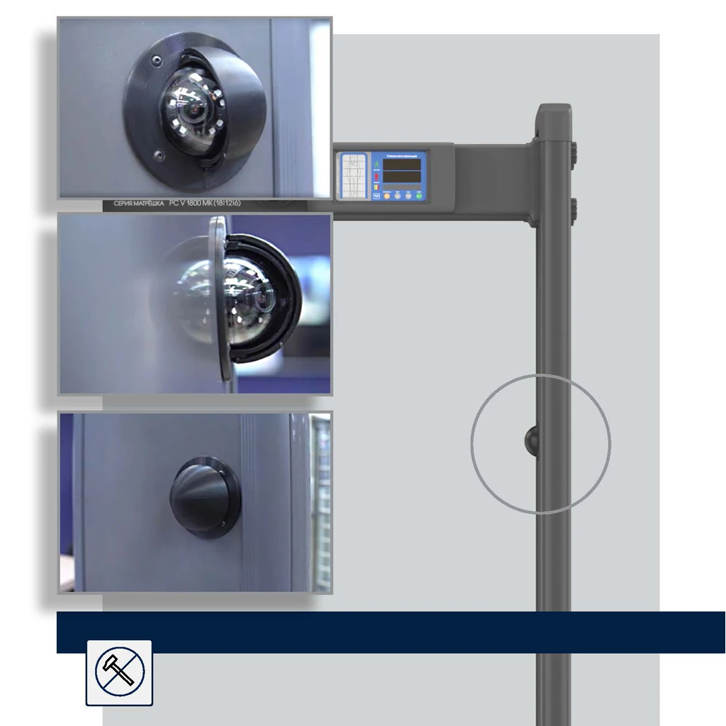 Камеры видеонаблюдения вмонтированы в перекладину и в антенные панели металлодетектора PC Vx 1800, соответственно, для них не требуются дополнительные конструкции для монтажа. Все элементы питания для камер видеонаблюдения встроены в металлодетектор по умолчанию. Желаемое количество записывающих устройств в модели РС Vx 1800 обсуждается с покупателем индивидуально.