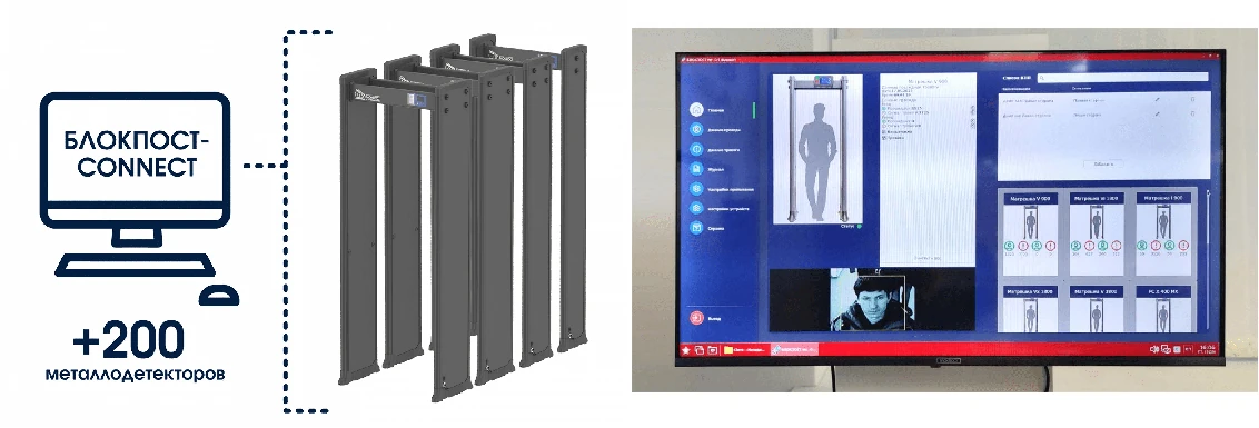 - Подключение ПО «БЛОКПОСТ-CONNECT». Программное обеспечение позволит сотруднику охраны просматривать записи с камер видеонаблюдения для выявления потенциально опасных действий со стороны посетителей или места локализации обнаруженных металлодетектором запрещенных к проносу предметов.