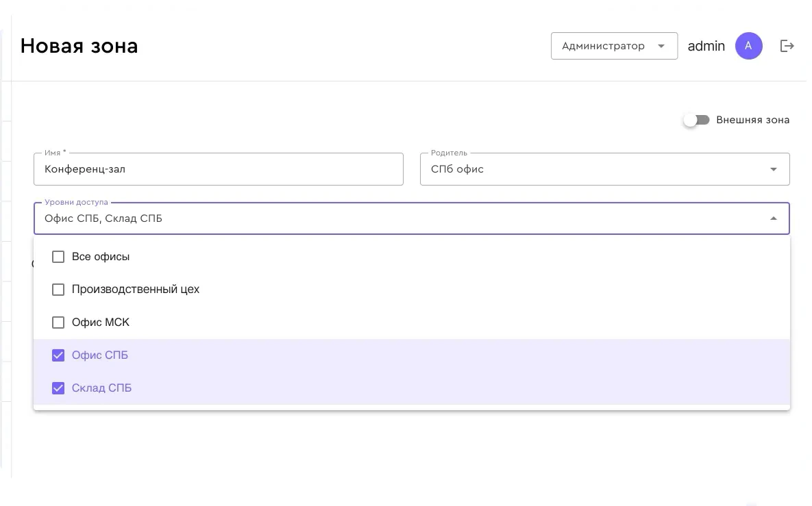 - Уровни доступа — привязка территориальных зон к конкретному пользователю с указанием зон, в которые разрешён проход.