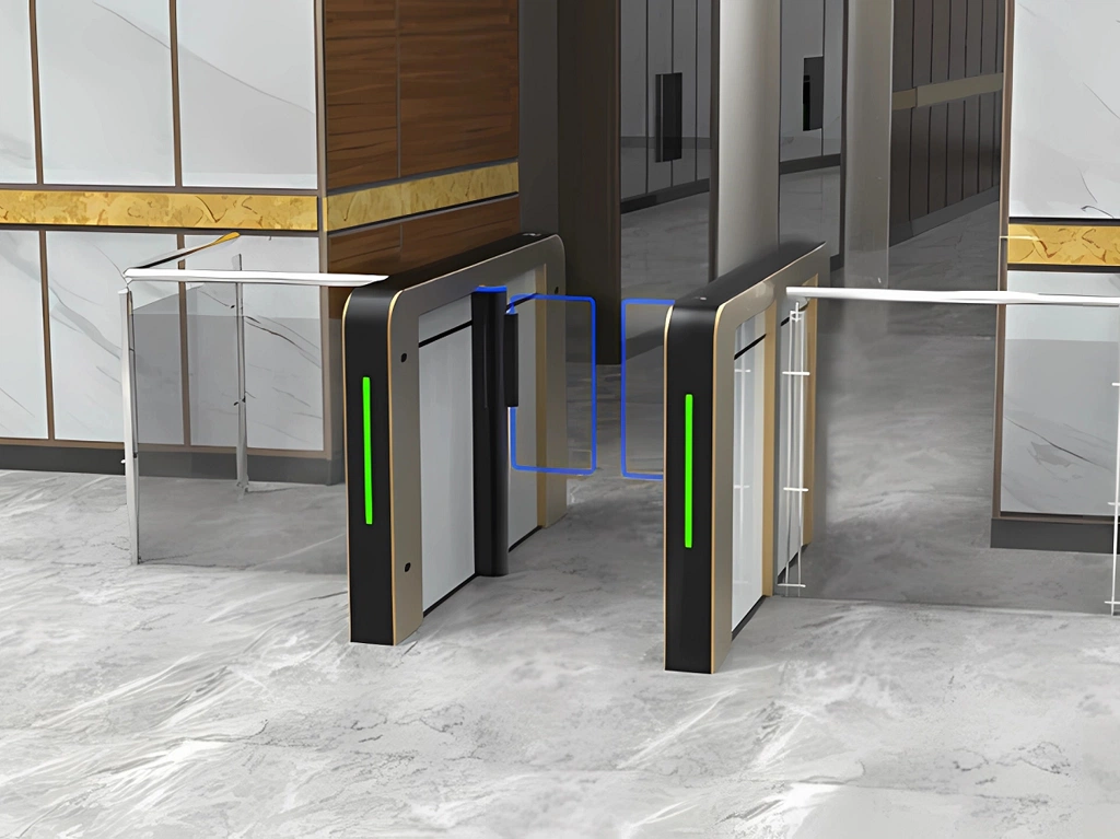- Функция защиты от защемления с помощью ИК-датчиков. Когда ИК-датчик обнаруживает, что в проходе находится пользователь, поворотный механизм автоматически возвращается в открытое положение;