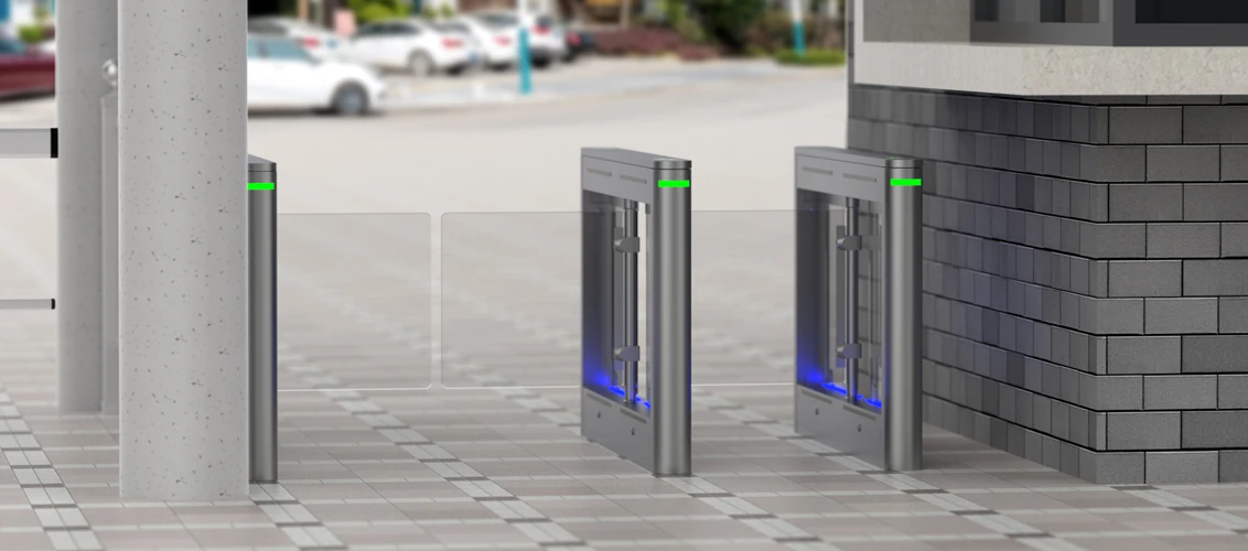 - Полуростовой распашной турникет со створками из акрила или нержавеющей стали.